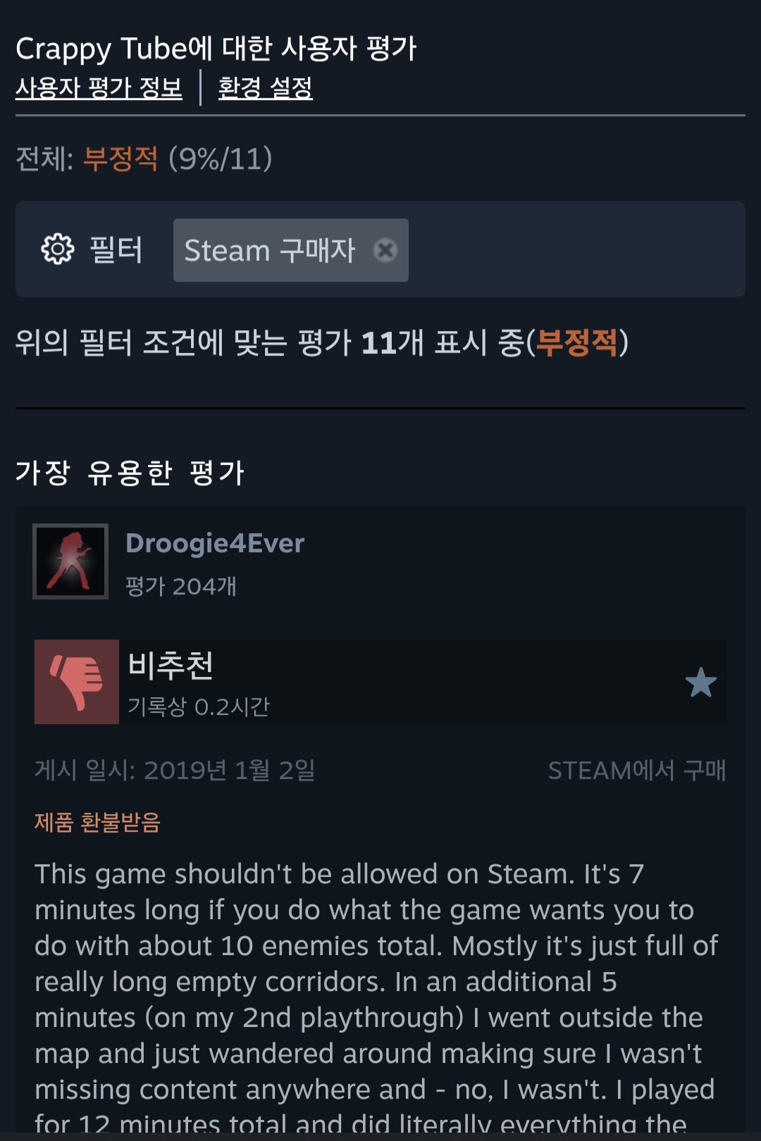 그런데 다시한번 위 사진을 보시면 분명히 "이 게임에 대한 사용자 평가 11개 중 9%가 긍정적입니다."라고 나와있습니다.