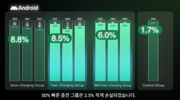 - 고속 충전과 저속 충전의 배터리 성능 저하 차이는 무시 가능한 수준