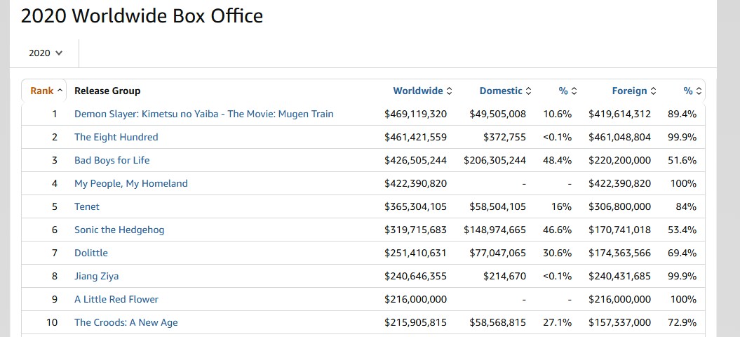 2020년은 일본만 개봉했고 우리나라를 포함해서 나머지는 2021년에 개봉함. 무한열차 2020년 흥행은 3억6천만이고 2021년 1억 4천 정도 흥행은 해외에서 개봉하면서 기록함. 그러니깐 2020년 영화와 2021년 영화의 기록이랑 비교해야지. 시스템상 2020년 흥행에 다 잡혀서 착각하신거. 2020년 성적은 나쁜 녀석들이나 내수용 중국 영화들 성적이 더 좋음. | 25.10.02 09:53 | | |