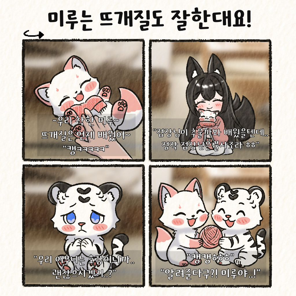 어서오세오! 맞아요! 미루가 쪼꼬만 손으로 깨작깨작 만들어서 아주작지만ㅎㅎㅎ 애정가득하대용 ㅎㅎ 과연 호시는 얌전히 목도리를 짤 수 있을까요?> | 25.11.26 21:53 | |