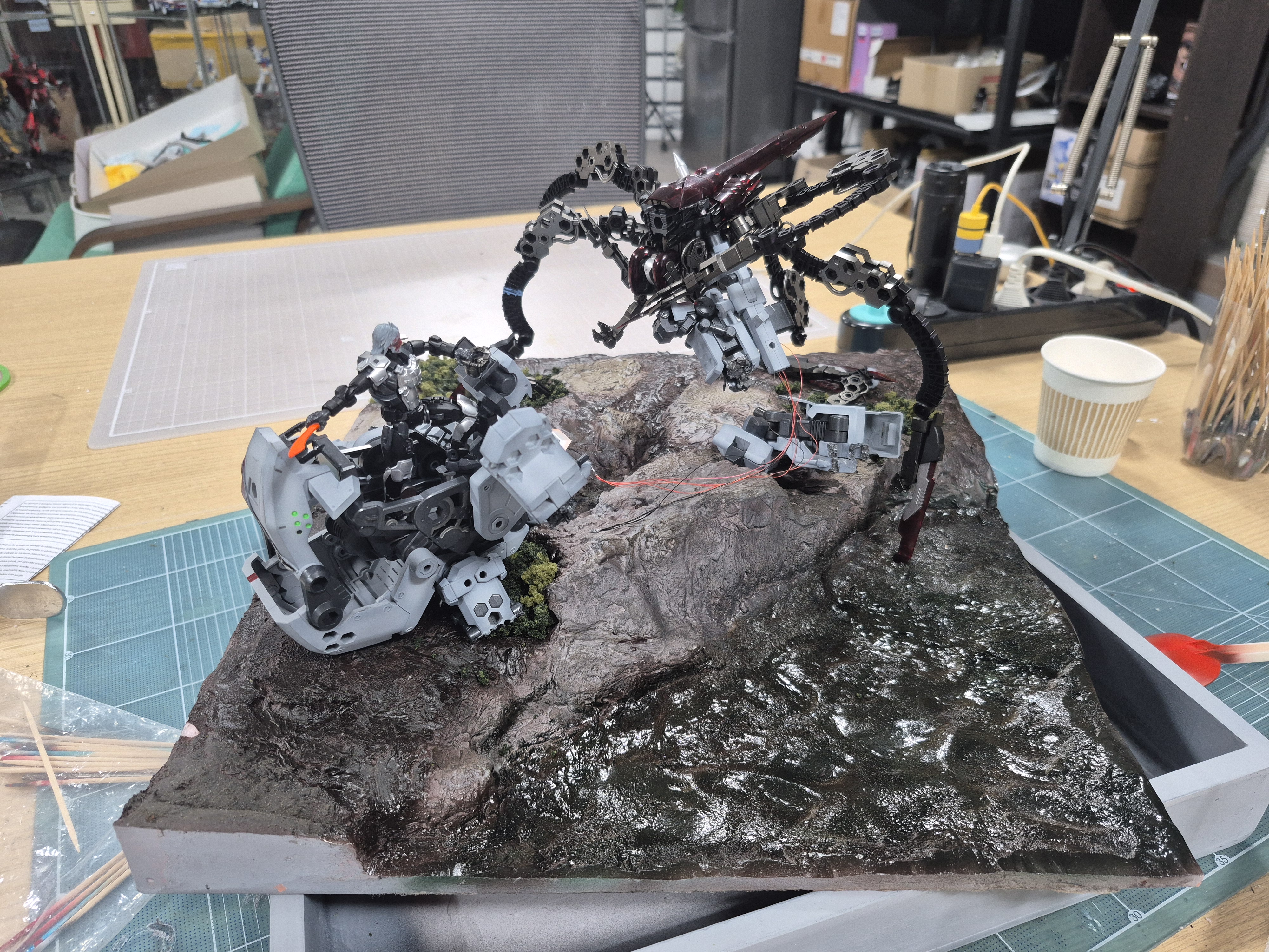 그러다 발상을 전환하여 그냥 숨기는걸 포기하고 전선 또한 요소로 써먹었습니다. 부러진 관절의 구동계가 완전히 끊기지 않아 관절 일부가 질질 끌린다는 느낌으로...