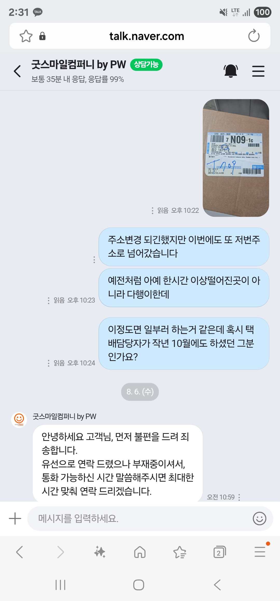 저 일이 있고나서 pw에서 주문한 제품 예약취소했는데 깜빡한게 몇개 발생 이거도 잘못받으면 안되니 톡톡으로 주소지 다시보냈는데 또 예전주소로 배송함 ㅋㅋㅋㅋ 하도 열받아서 상담사 연결후 "전에도 잘못 보내더만 또 이러냐. 혹시 작년이랑 같은 담당자냐 " 하니까 "그 직원은 퇴사했고 번거롭게 해서 미안하다. 택배비 쿠폰 보내드림" 하고 대화마무리