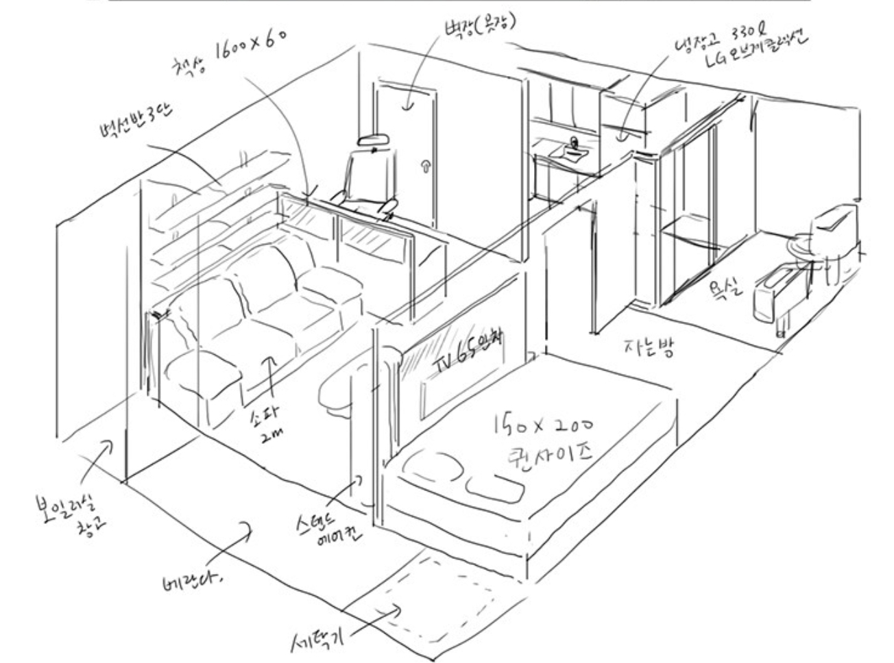 원래 도면은 이런 형태의 분리형 원룸 아파트 입니다. 12평이고요.