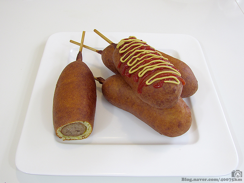 막대기에 꽂아서 튀긴 모습이 마치 옥수수같다고 해서 콘도그라고 하는데, 그보다는 반죽을 만들 때 옥수수가루 (콘밀)이 주 재료로 사용되기 때문에 이런 이름이 붙었다는 주장이 더 설득력 있습니다. 왜냐하면 초창기 콘도그는 막대기가 없는 형태였거든요.