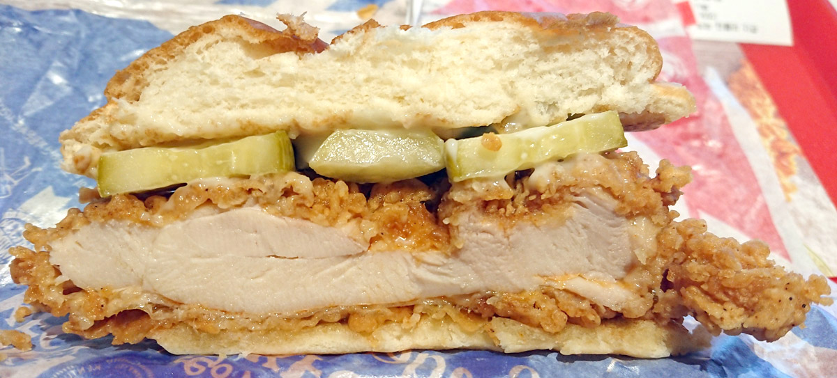 양상추가 없는 닭다리살 치킨버거입니다. 양상추가 없기 때문에 기름진 느낌이 상당히 강하고, 거기에 위아래로 단맛 마요네즈와 허니버터 소스가 있습니다. 양상추가 없는 건 굉장히 중요한데, 이것 때문에 기름진 맛이 강조되고 아삭힌 식감이 사라지기 때문입니다. 그래도 오이 피클과 빵이 있으니 기름기만 있는 것은 아닙니다