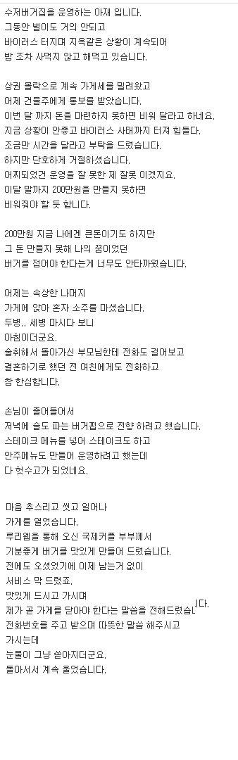 1시간 넘게 기다린 대여섯명의 손님들한테, 그것도 '힘들다, 돈이 필요하다, 돈이 없으면 내 꿈을 접게 된다, 제발 도와달라.' 이런 말씀을 하신 본인께서