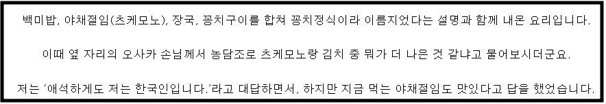 저는 ‘애석하게도 저는 한국인입니다.’라고 대답하면서, 하지만 지금 먹는 야채절임도 맛있다고 답을 했었습니다.