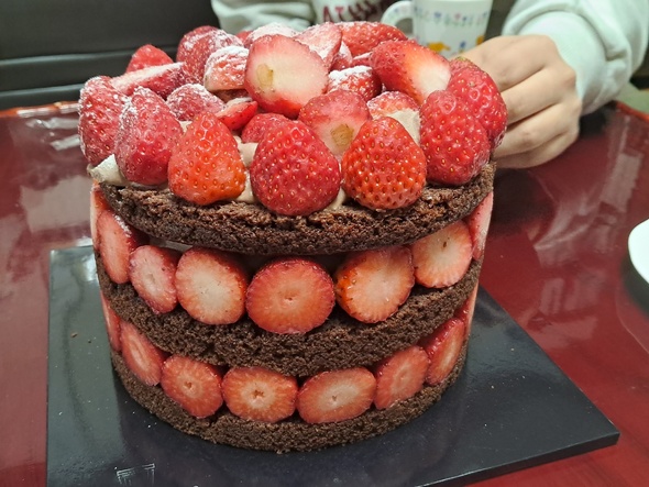 초콜릿 케이크를 삼단으로 해서 초콜릿 크림, 생 딸기를 잔뜩 올렸어요.