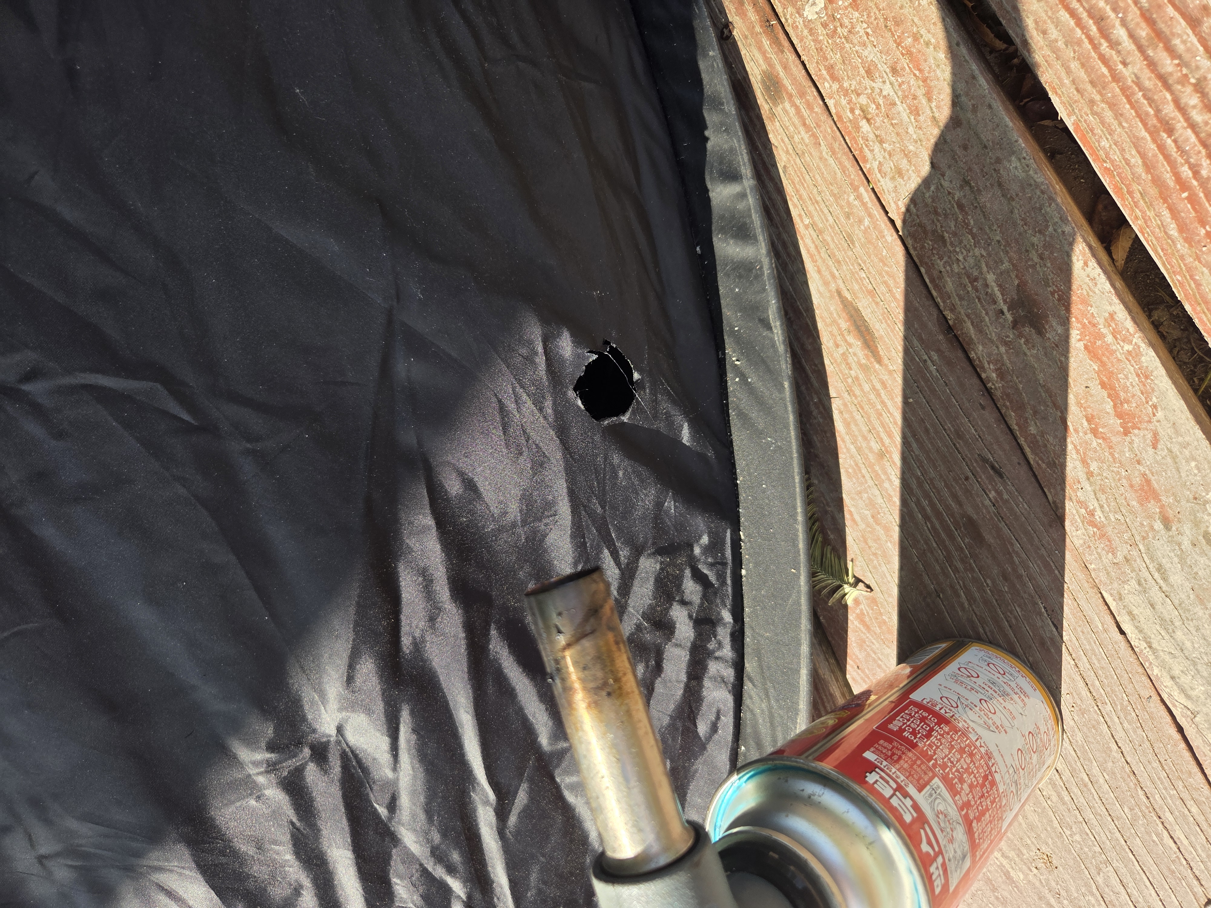 그리고 어제 토치 쓴 직후 쓰러트려서 텐트에 난 구멍