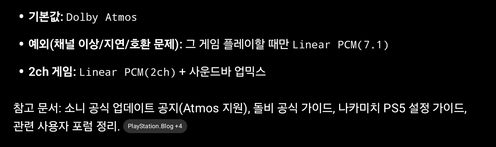 돌비 애트모스 지원게임할때는 오디오형식을 atmos로 놓고 사용하고 애트모스 미지원게임은 lpcm으로 놓고