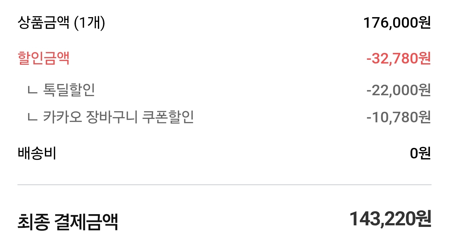 톡딜위크 1일차 7%할인 쿠폰을 받아서 10,100원 할인이 되었는데 카카오페이 머니나 카카오페이 카드로 구매하면 즉시 할인이 또 들어갑니다.