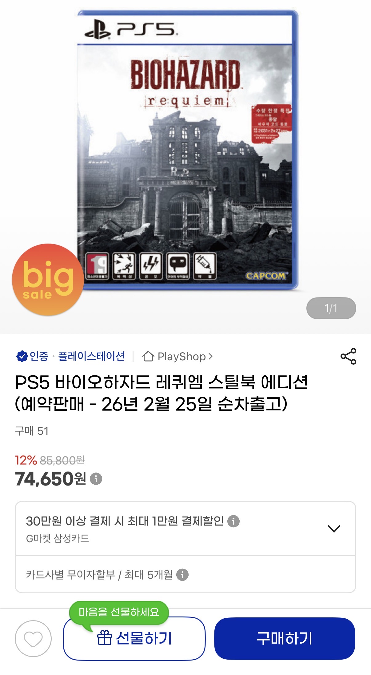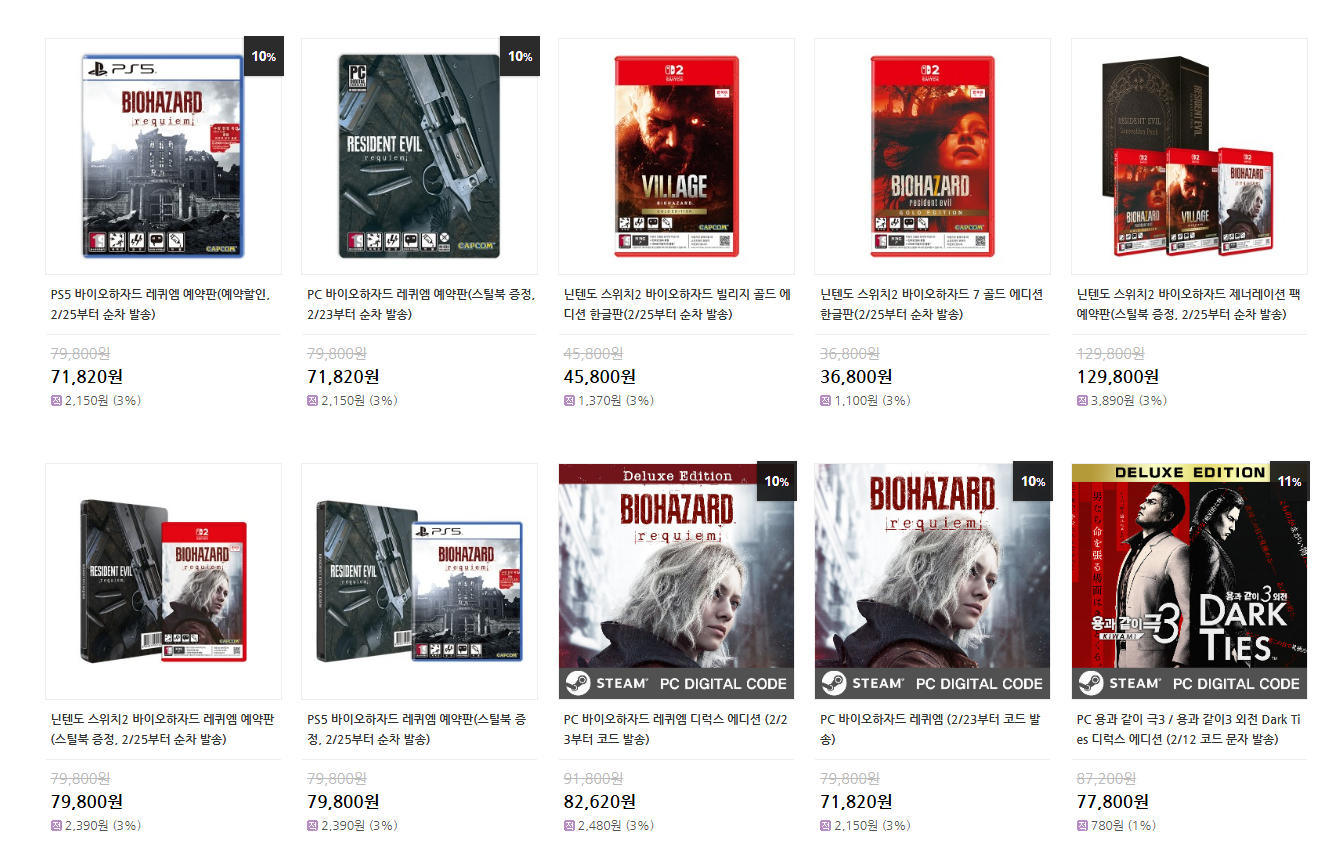 다나와에서 PS5 바이오하자드 레퀴엠 검색후 무료배송 G마켓 74,650원 누르셔서 구매하시면 저렴하게 구매할수 있습니다. 스틸북 포함입니다.