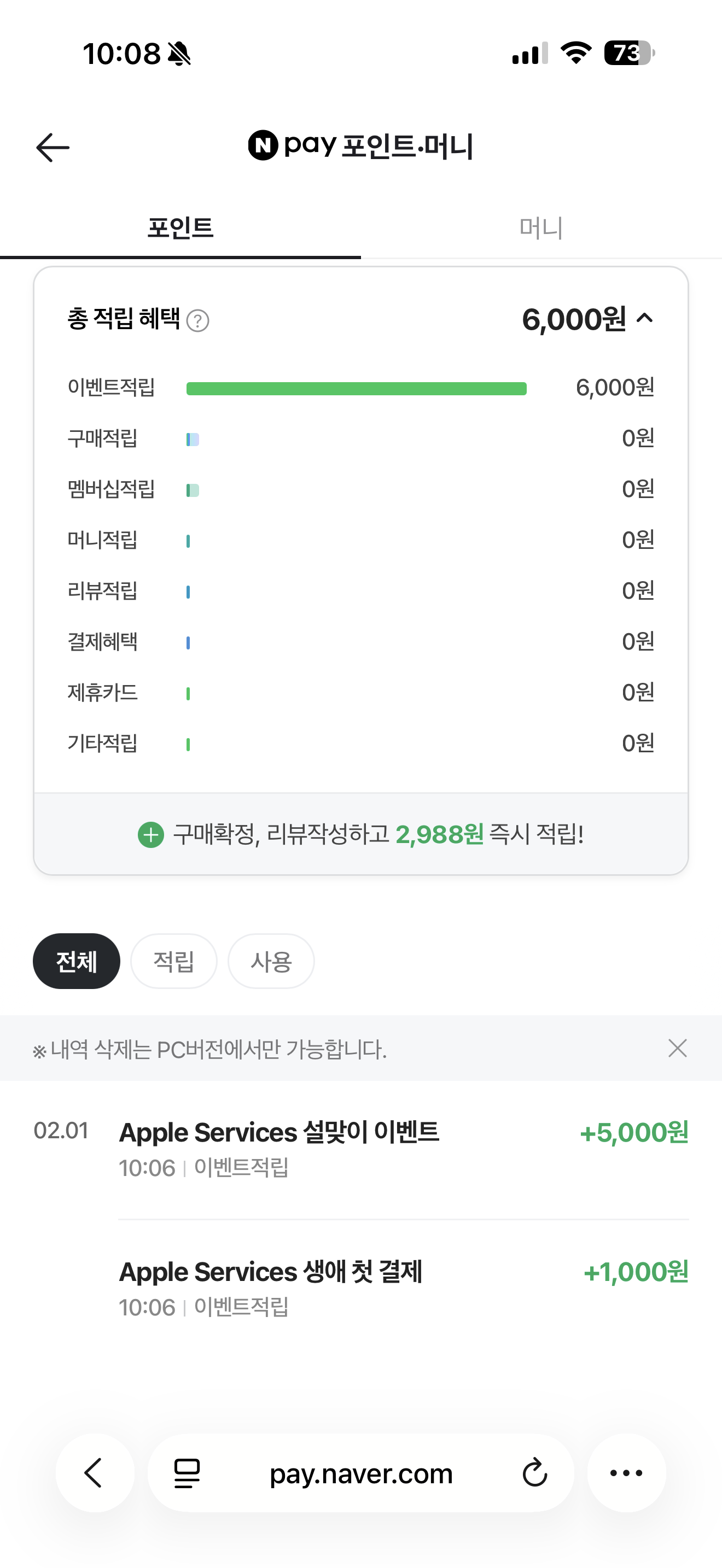 혜택신청하기 클릭하고 결제수단에 네이버페이 추가하셨을까요? 그럼 이렇게 적립되요.