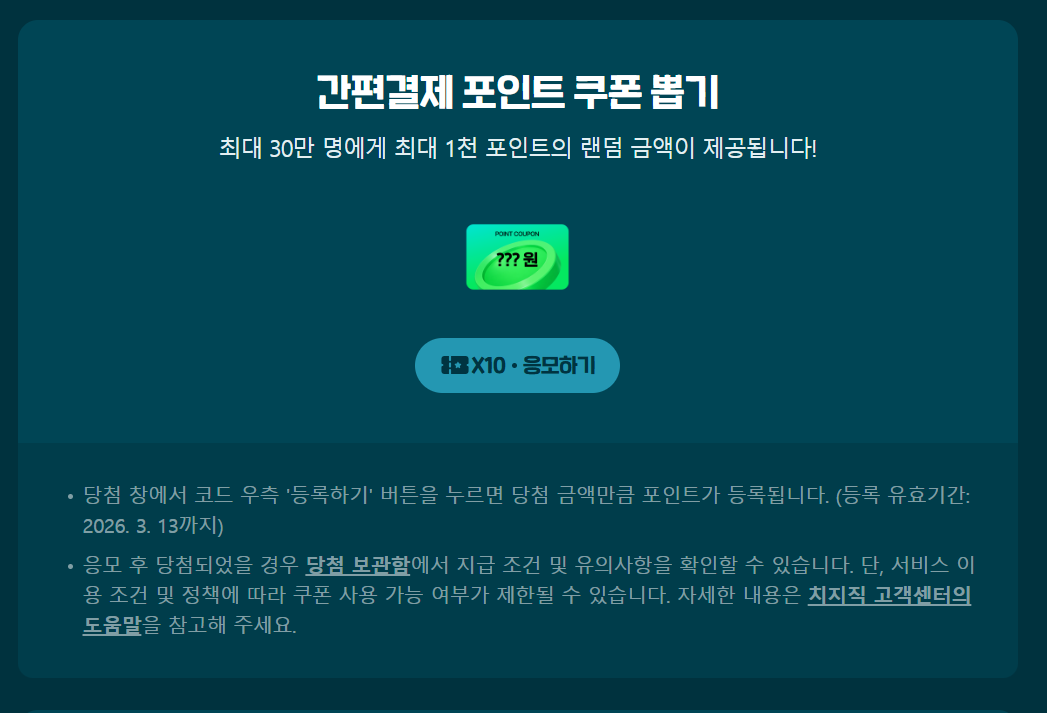 https://chzzk.naver.com/event/chzzk-sports-event 치지직 동계올림픽 네이버페이 응모하기 있는데 로그인하시고 티켓 확인하면 10개 줄겁니다 응모하면 코드 주는데 최대 1,000원 랜덤포인트 입니