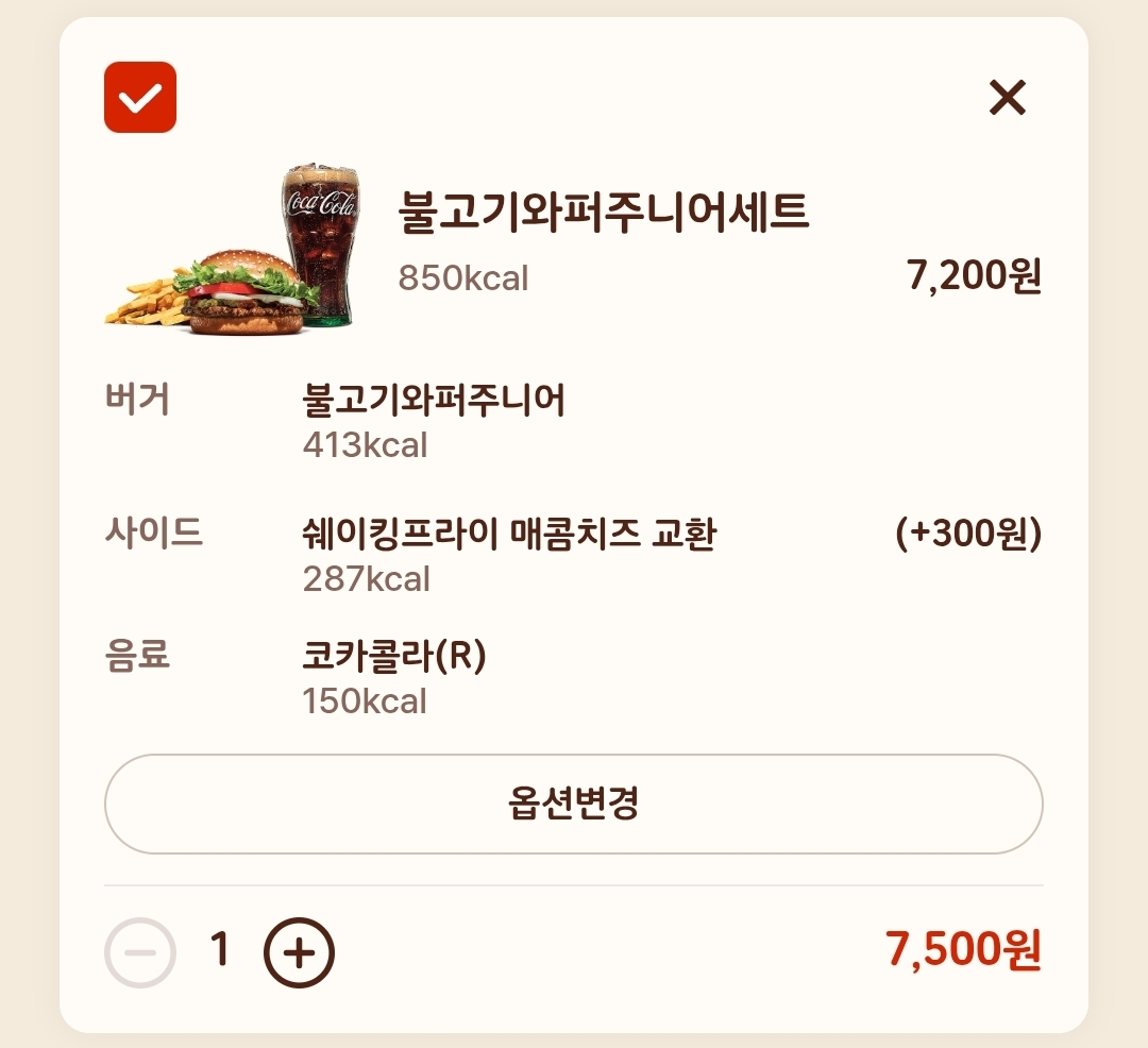 첫번째 조합인 불왚주+쉐이킹프라이+콜라R은 9800원이 아니라 7500원이 정가고 20% 할인률 참고로 올데이킹에서 통새우왚주 세트 6000원입니다