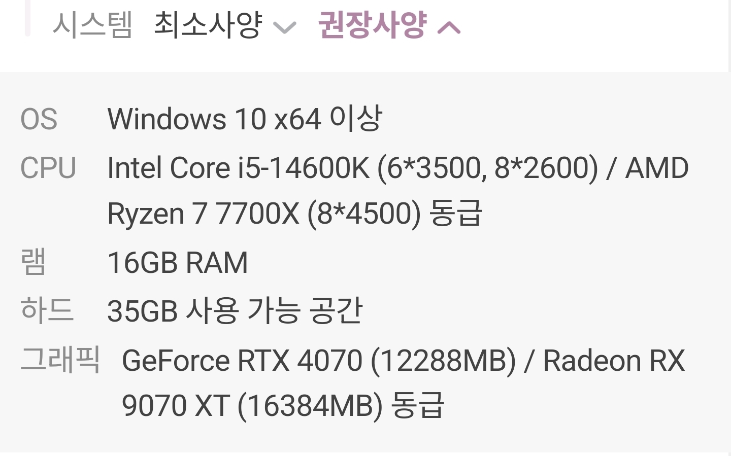 권장사양 그래픽 카드가 상딩히 엔당 친화인가보네요 지포스는 4070인데 라데온은 9070xt 최상급을 요구하네 | 26.03.06 21:31 | | |