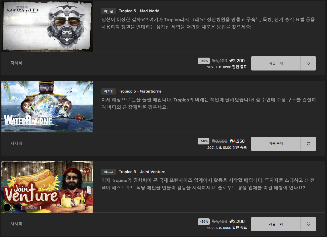 이거 구입하느니 다렉에서 트로피코 5 컴플 사시는거 추천. DLC 다 포함이고 5000원밖에 안해요 | 20.12.24 03:11 | | |