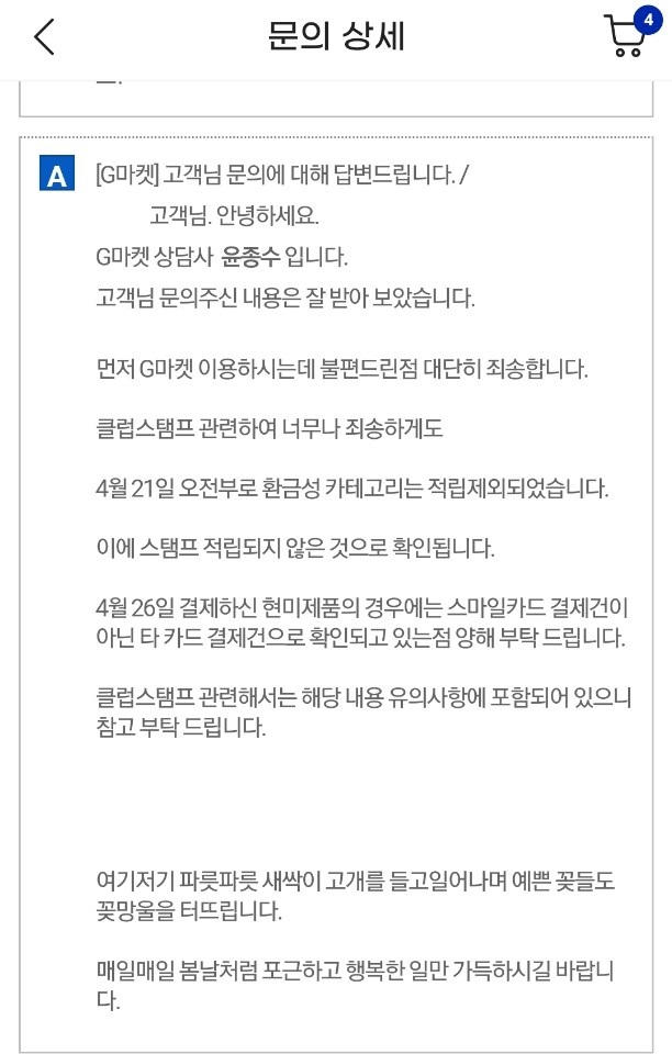저도 그제 쿠폰 구매급해서 하나 샀는데 스탬프 안주길래 문의 했더니 저번달 21일 이후로 환금성 카테고리는 적립 제외라고 합니다.ㅠㅠ | 21.05.03 14:41 | | |