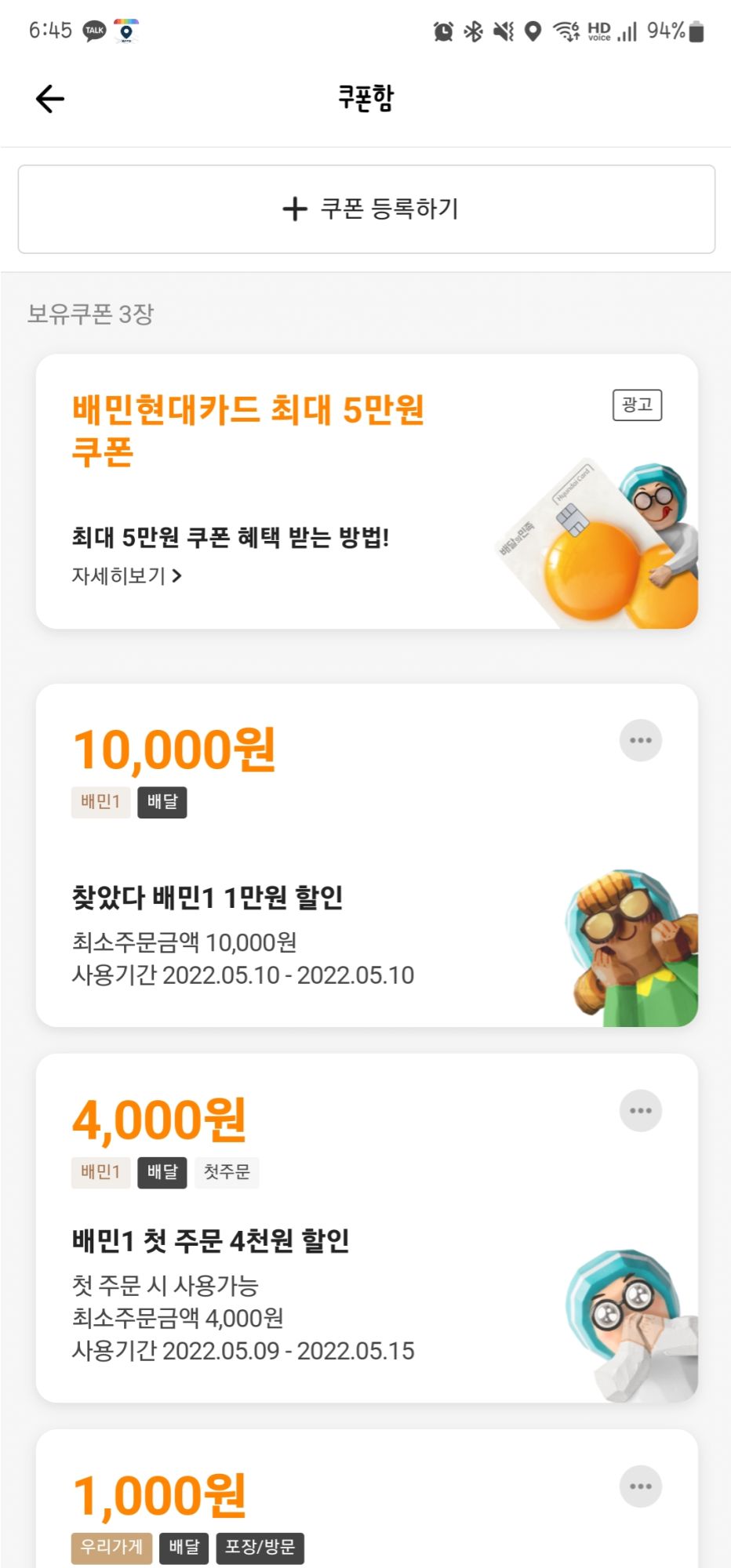 강남구로 주소 바꾸면 배민1에 이벤트 배너에 뜨더라고요 | 22.05.10 11:55 | | |