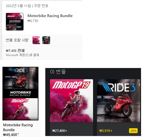 지금 세일에 포함된 물건 중 모터바이크 레이싱 번들은 49,400 으로 나오는데, 그게 정가로 되고 세일가 (몇% 할인해서 얼마다 하는 내용) 가 계산이 안 되어 있습니다. 실제 안에 들어가면 27,400원 + 5,910원 두 게임으로 구성된 걸로 나옵니다. 합이 안 맞죠? 게다가 이 번들은 2주 전 7,410원 으로 판매되고 있었는데 뭔가 오류로 4만원대 가격으로 나오는 것 같습니다.