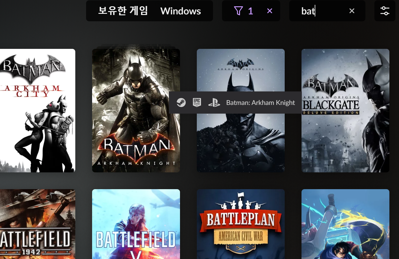 gog의 게임런처인 gog galaxy 설치하고, 거기에서 스팀, 에픽, 오리진, 유플레이, PS, XBOX의 계정을 동기화하면 모든 플랫폼 게임을 한번에 관리할 수 있어요. 가령 저는 배트맨 아캄나이트를 스팀, 에픽, PS계정에 가지고 있습니다. 구입전에 이렇게 한번 확인하면 중복구매 피할 수 있어 좋습니다.