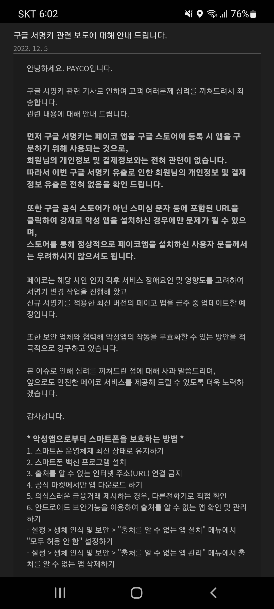'천만 페이코' 서명키 유출 넉달이나 뚫린 것 몰랐다 [단독] '페이코 위장' 피싱앱에 통장비번도 털린다 https://n.news.naver.com/article/009/0005055720?sid=101 조심하시길....