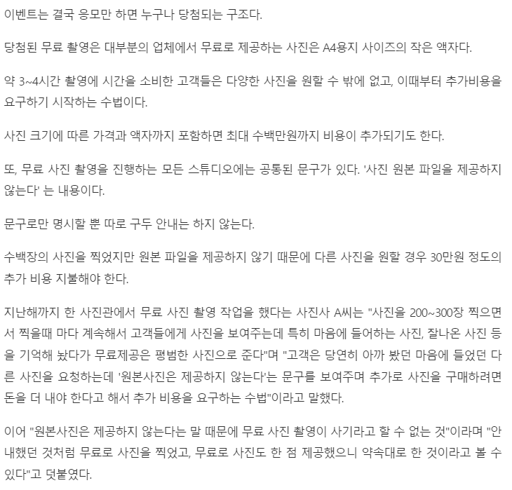 절대 하지마세요 유튜브만 봐도 사기당한 얘기들 한트럭씩 나옵니다 그냥 동네 사진관 가시면 얼마 안나오고 잘 찍어주시니 거기ㅜ가세요 | 22.12.28 10:33 | | |