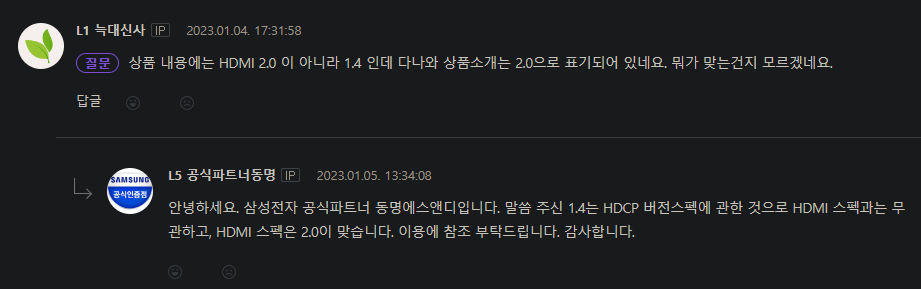 그냥 제 느낌으로는 아마 2.0이 맞을 것 같습니다. 1440p@165hz 모니터에 HDMI 1.4를 달고 나오기는 힘들죠. 그것도 신제품이요. | 23.01.09 18:43 | | |