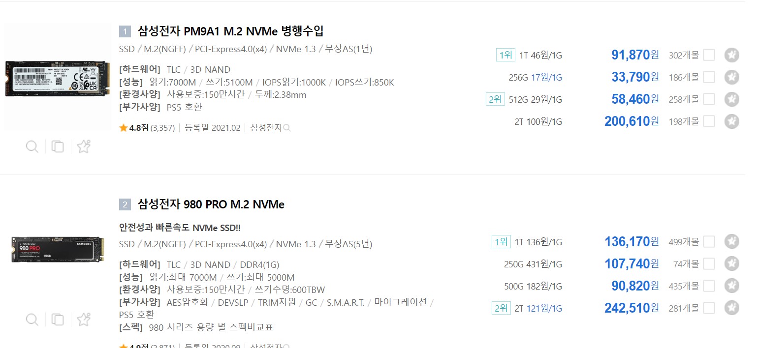 플스5에 쓸수있는 삼성제품은 1테라가 이제 9만원 13만원밖에 안하는데 더 느려터지고 용량은 작은 제품이 19만원이라니...