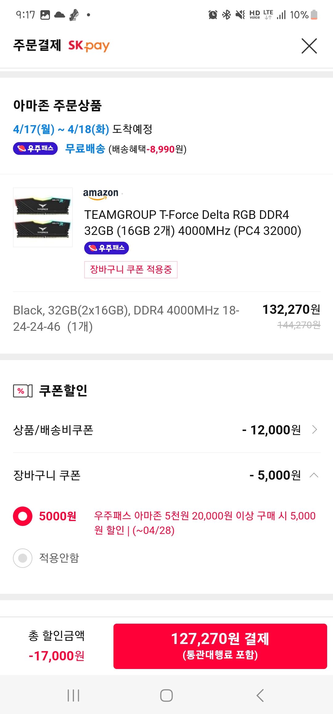 Rgb 원하시면 이 제품 좋습니다. 장바구니쿠폰 있으면 12만7천까지 다운되고요 현재 검정 흰색 다 있고RGB되고 배송도 일주일 정도로 겁나 빠릅니다. 어제 받아서 꼽았는데 XMP 자동으로 CL18 4000으로 잘 들어갑니다.
