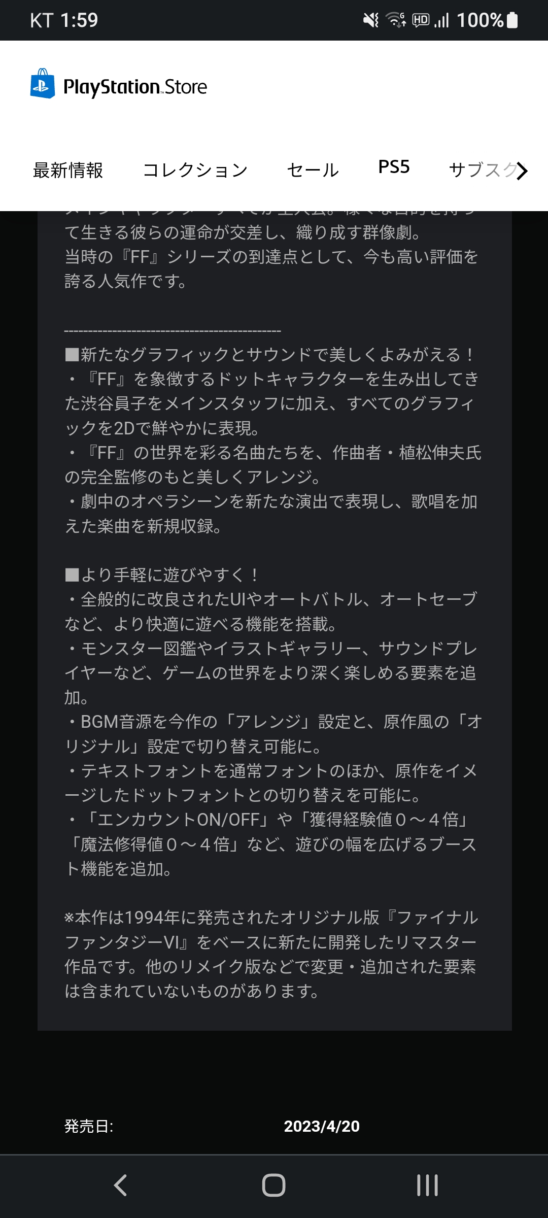 5는 pv에 부스트 기능 나왔었고, 6도 통상 인카운트 제로, 습득 경험치, 마석 경험치 0~4배 기능 추가 그 외에 BGM 오리지널/어레인지 선택 가능, 폰트 고딕체와 도트 폰트 중 선택 가능(한글판은 어떻게 될지 모르겠음) 잠수함 패치로 4의 카인 점프, 5의 무기 이펙트가 원작에 가까워졌습니다. 스팀판에도 패치해줄지는 모르겠네요. 6 습득 경험치 0배+인카운트율 0% 기능 때문에 많이 땡기네요 | 23.04.12 02:04 | | |