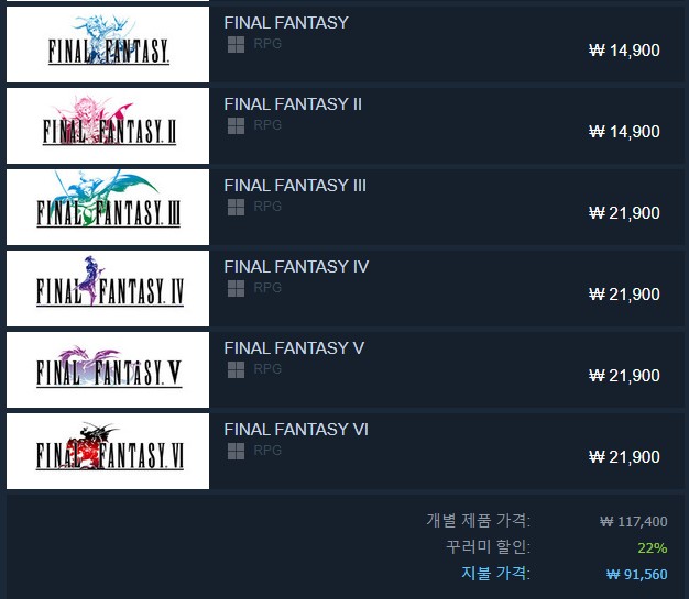 글쎄요. '할인 씨게 오는게' 얼마를 말씀하시는지 모르겠는데 픽셀리마스터는 스팀에서 나온지 2년 다 되어 가는데 최고 세일률이 20% 였을텐데요. 그리고 다른 파이널판타지 본가들도 절대 세일률 50%보다 높게 안나옵니다. | 23.04.12 08:11 | | |