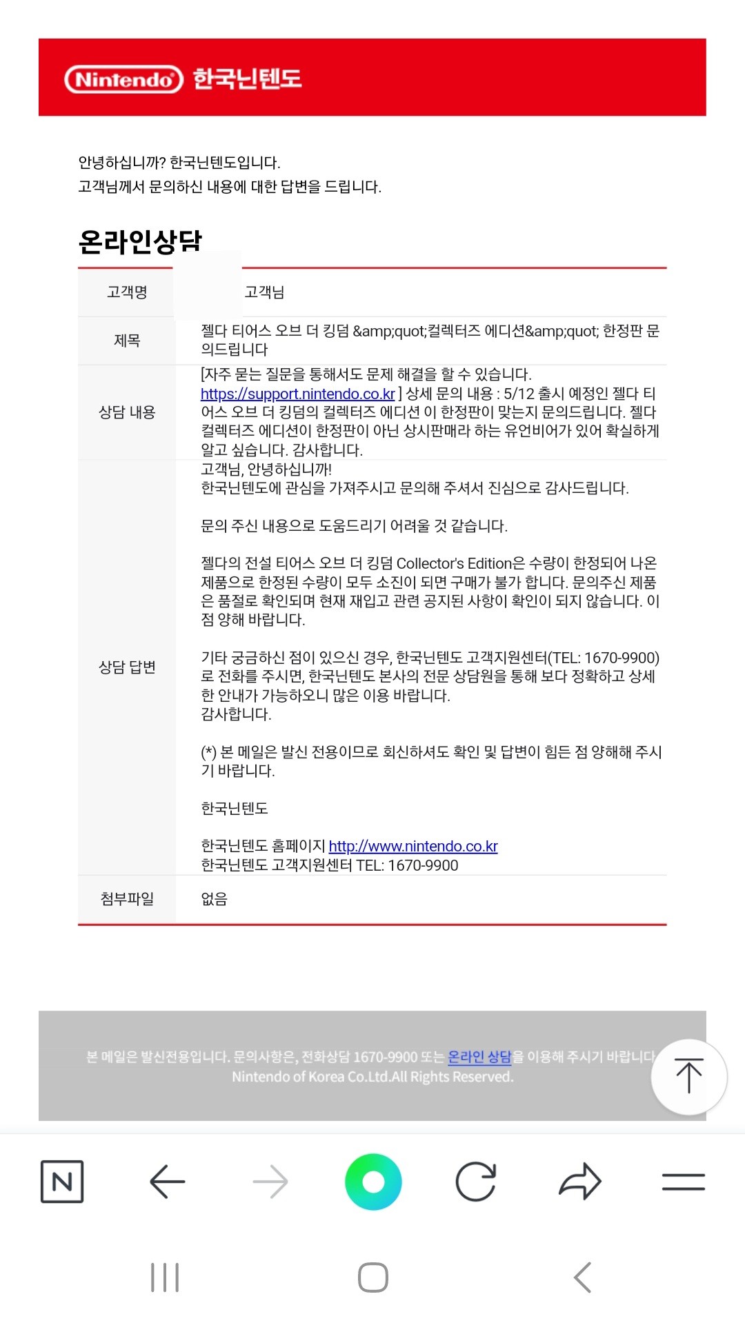 닌텐도 스위치 카페회원분이 닌텐도에 공식 질문하시고 답변 받으신 내용이에요 콜렉터즈 에디션은 한정판이 맞습니다 | 23.05.04 14:42 | | |