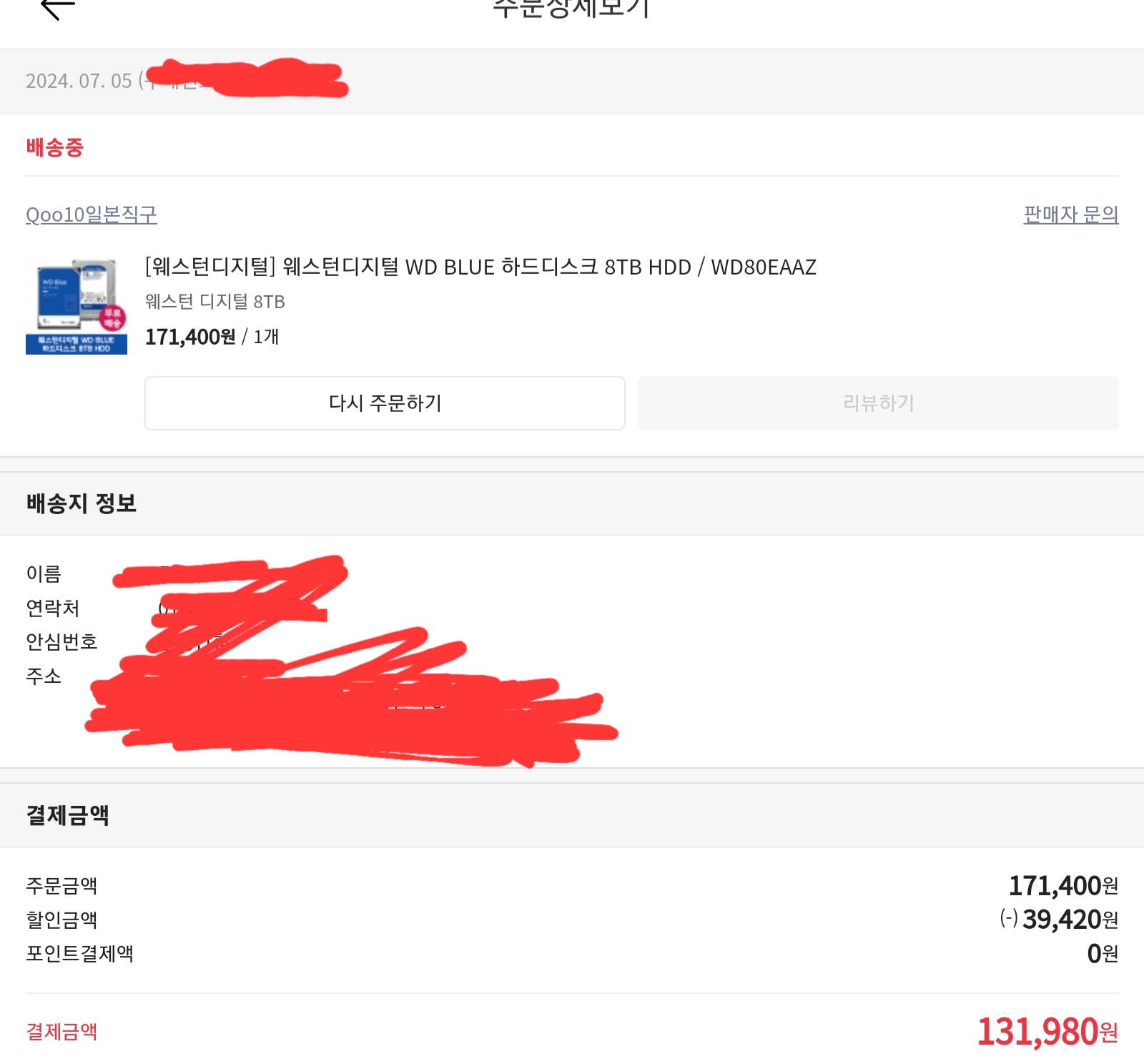 7월5일에 구배했어 화요일에 받음 귀찮았어옻언제 설치를 할지 8테라 맞음 | 24.07.25 09:11 | | |