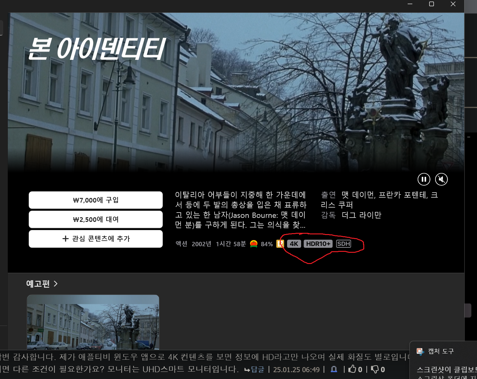 저도 구매페이지에서는 4k라고 저리뜹니다. 재생화면에서 정보클릭시 위 스샷처럼 hd로나오네요... | 25.01.25 09:00 | | |