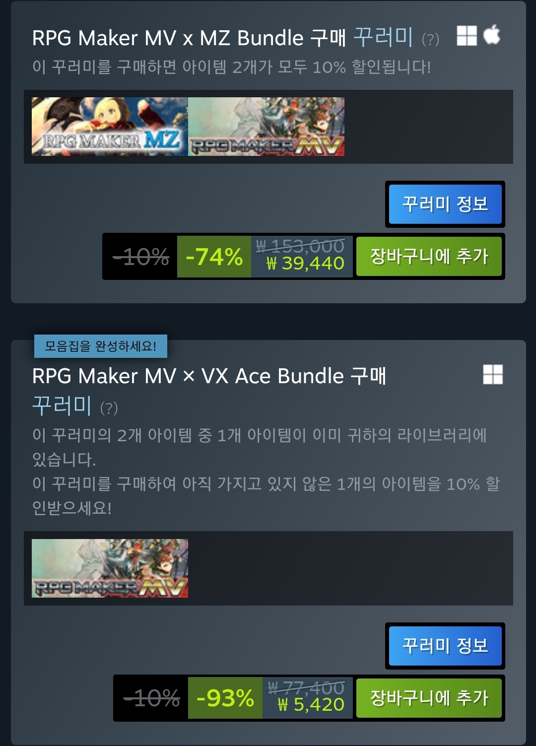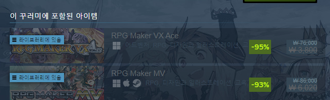 RPG Maker MV 들어가면 기본 6,020원으로 나오고, 아래로 내려서 꾸러미 상품 가격을 확인해 보세요. 위 스샷처럼 번들 상품에 MV만 있는 것을 선택하면 5,420원 나옵니다. | 25.02.08 10:12 | | |
