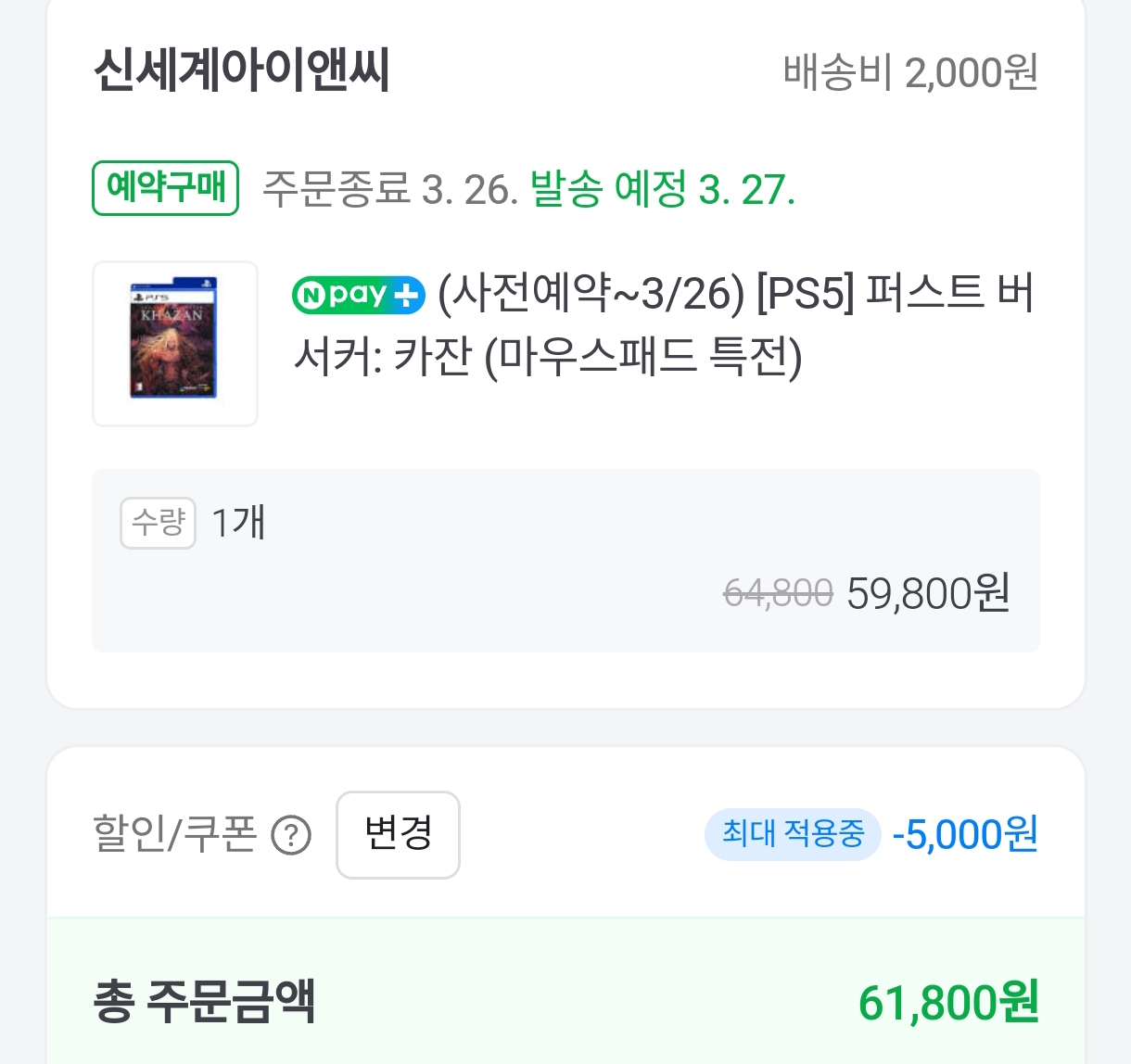 카잔 예약구매에 5천원 쿠폰 적용되네요.