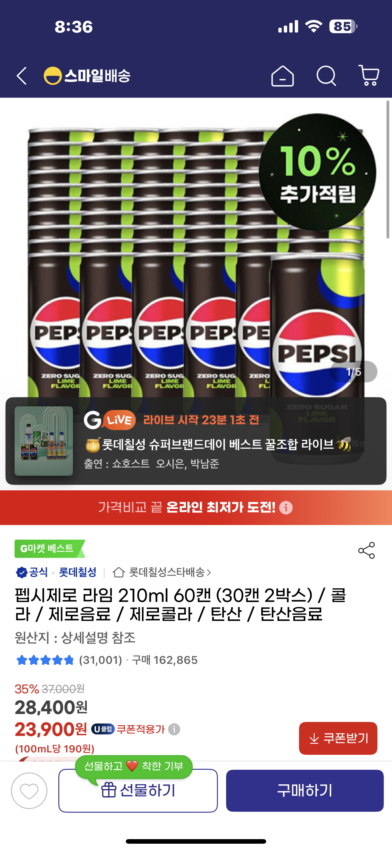 210ml 60캔 + 355ml 48캔하면 5% 추가 할인 (2,600원 정도) 스마일카드 결제 시에 2,200원 정도 적립해줘서 210ml 30캔에 체감가 만원 근처까지 깎을 수 있는거 같아요 | 25.02.14 20:50 | | |
