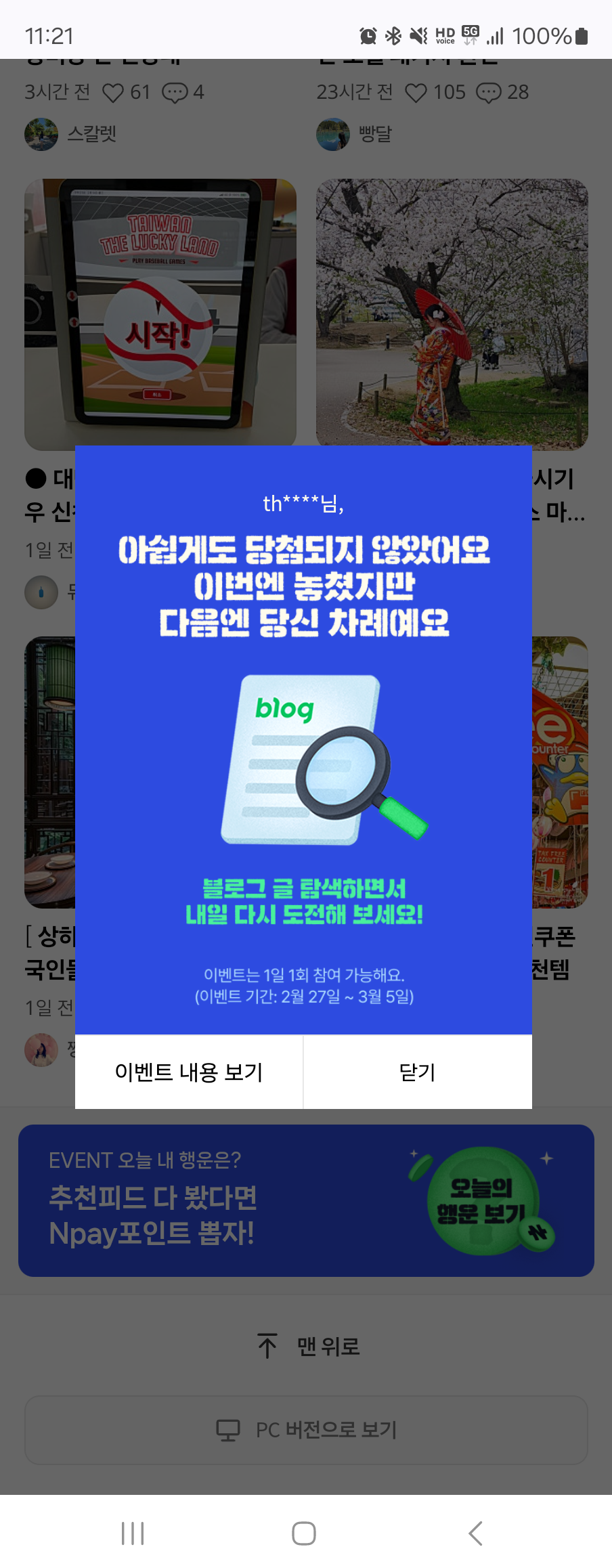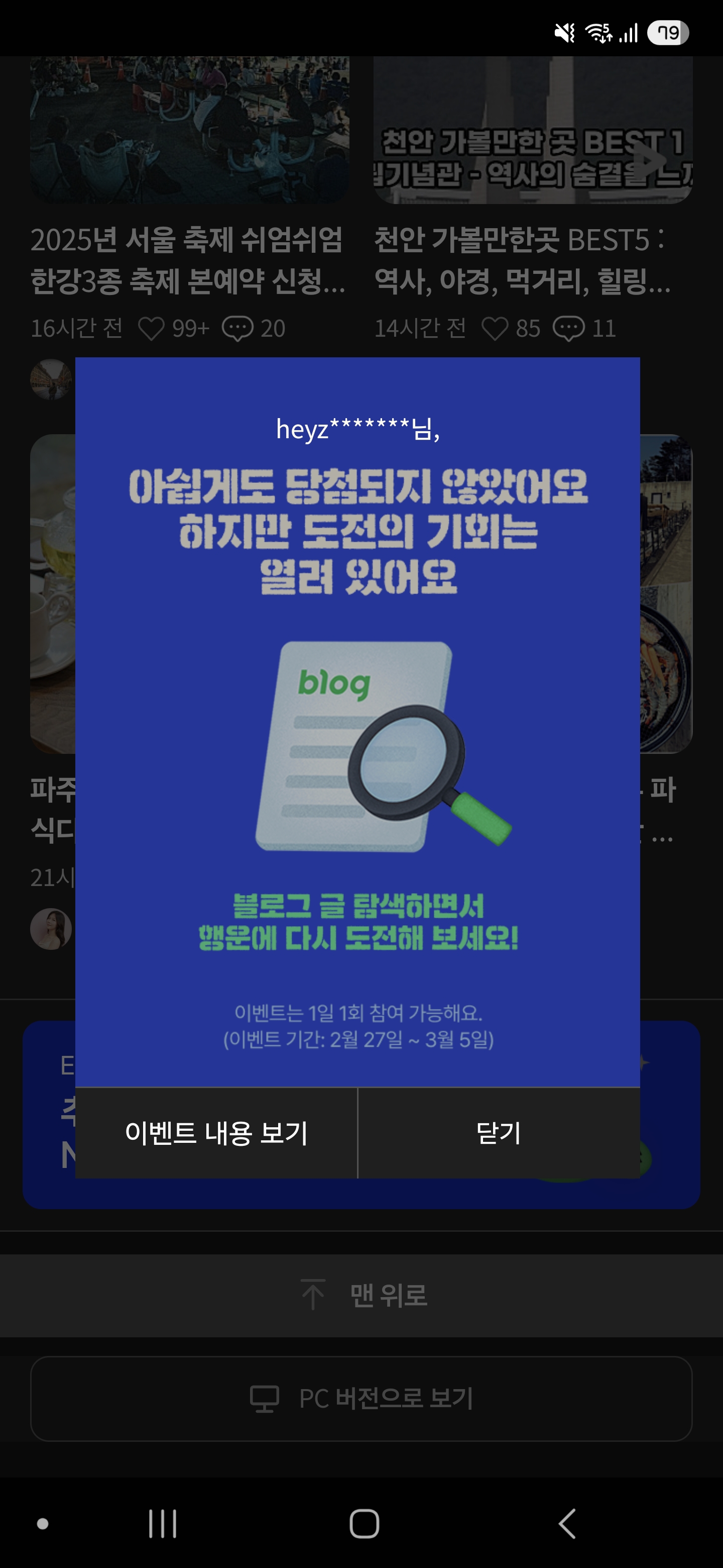 블로그 맞나요? 모바일 블로그 아무 글이나 들어가서 아래로 내리면 추천 포스트들 나오는데 그거 죽 내리면 됩니다. | 25.02.27 11:59 | | |