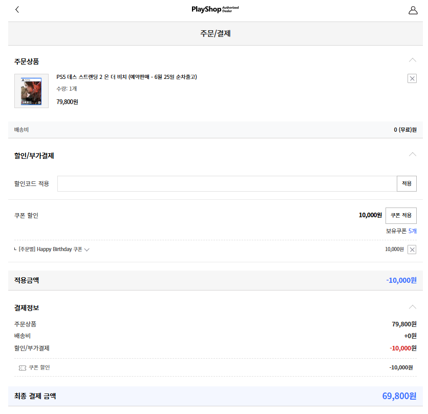 지금 데스스트랜딩이 아니더라도 생일쿠폰 받아놓으면 올해 12월31일까지가 사용 기한이라서 다른상품 구입에 사용할 수 있어서 나쁘지 않다고 생각합니다.