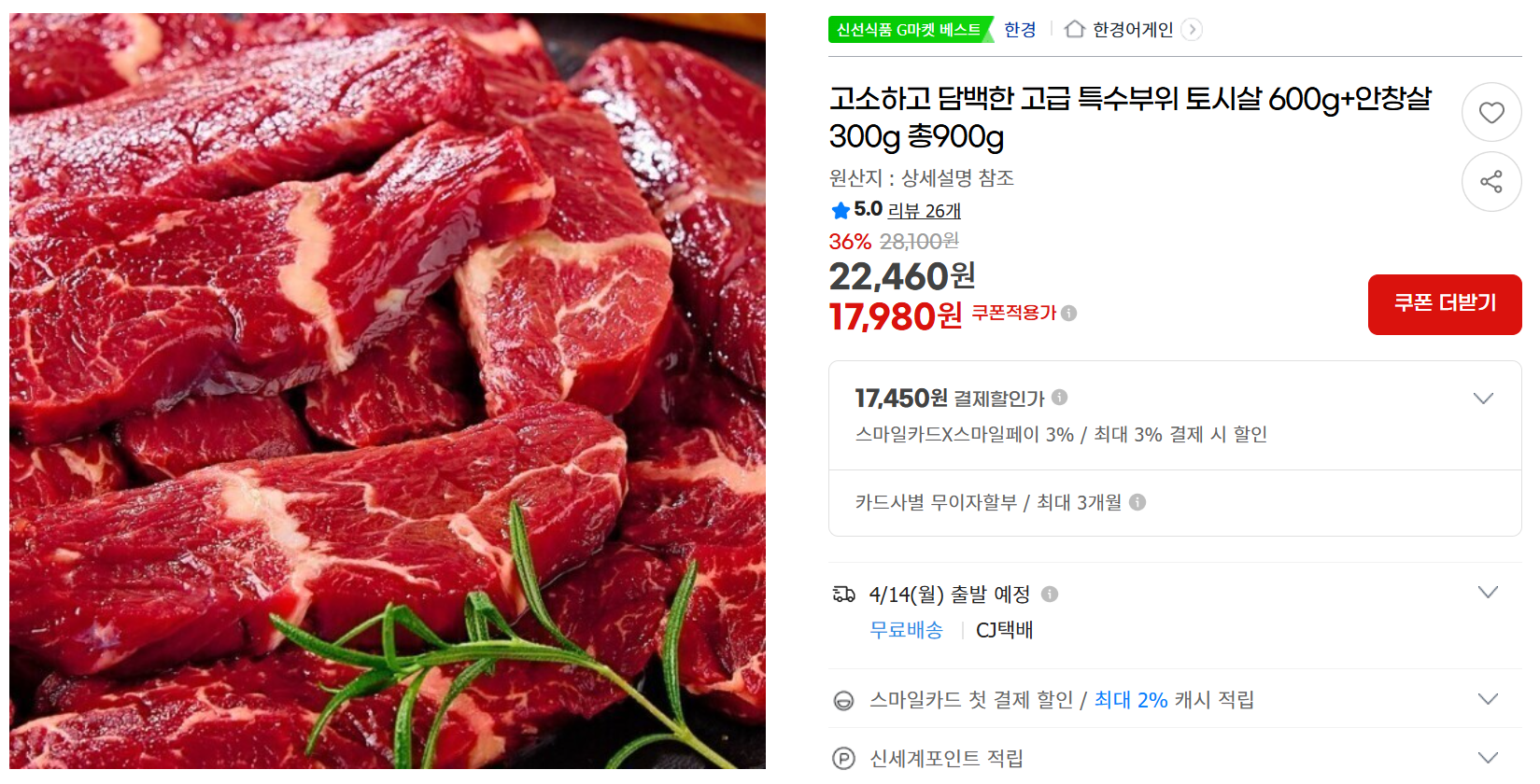 가격으로 보면 뉴질랜드산 방목 젖소인거 같습니다.. 방목 젖소는 고기가 질기고 육향이 진합니다.. 그래서, 연육과 냄새를 잡기 위해 양념한거 같은데, 고기 냄새 민감하신 분은 시도하지 않는게 나을거 같네요.. | 25.04.12 10:38 | | |