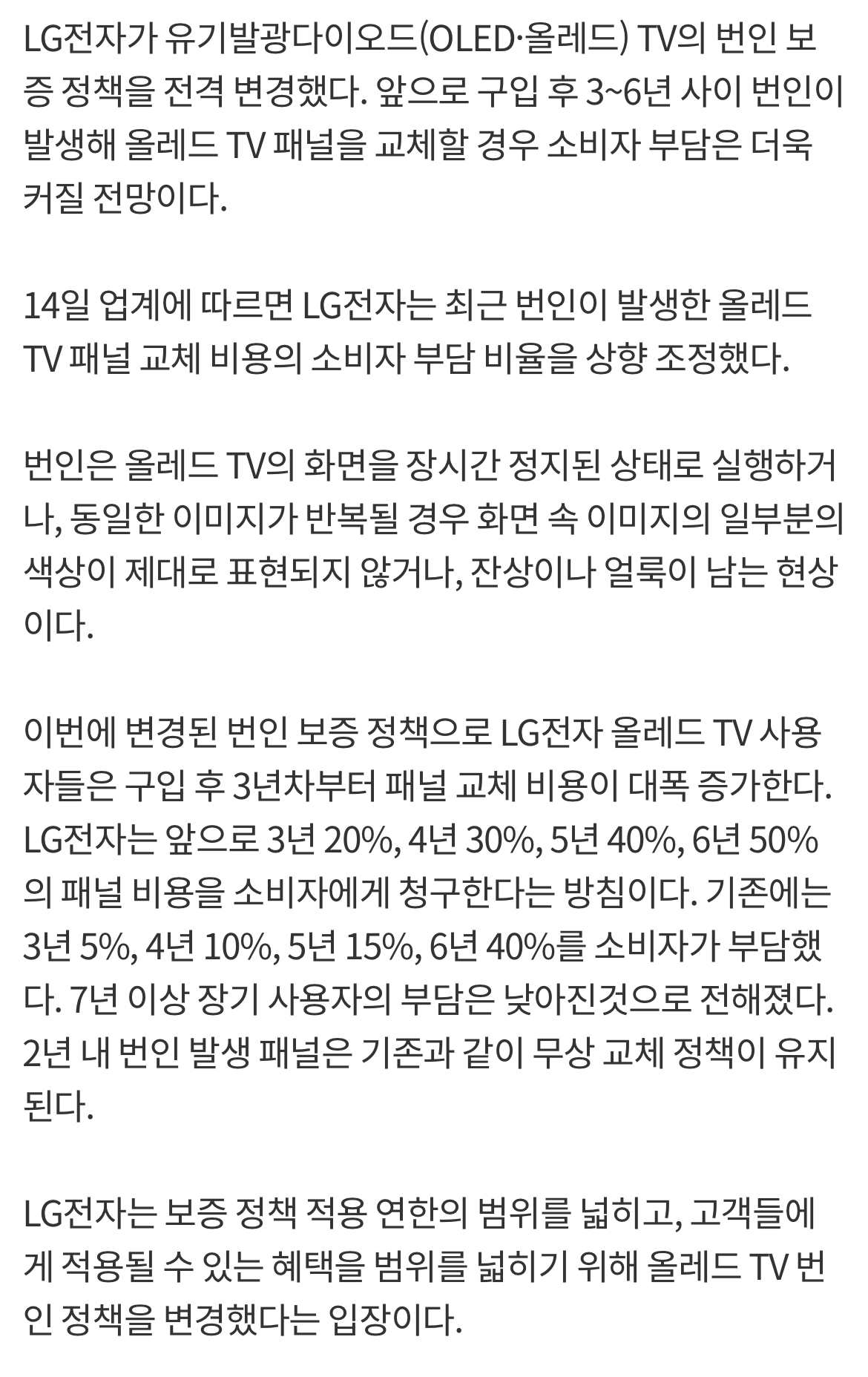 요즘 oled 정도로 화질 좋은 패널도 많아서 번인 감수하고 살 필요가 없어진듯 합니다. 그나마 교환 정책이 있으니 안심하고 쓴건데.. | 25.05.07 13:10 | | |