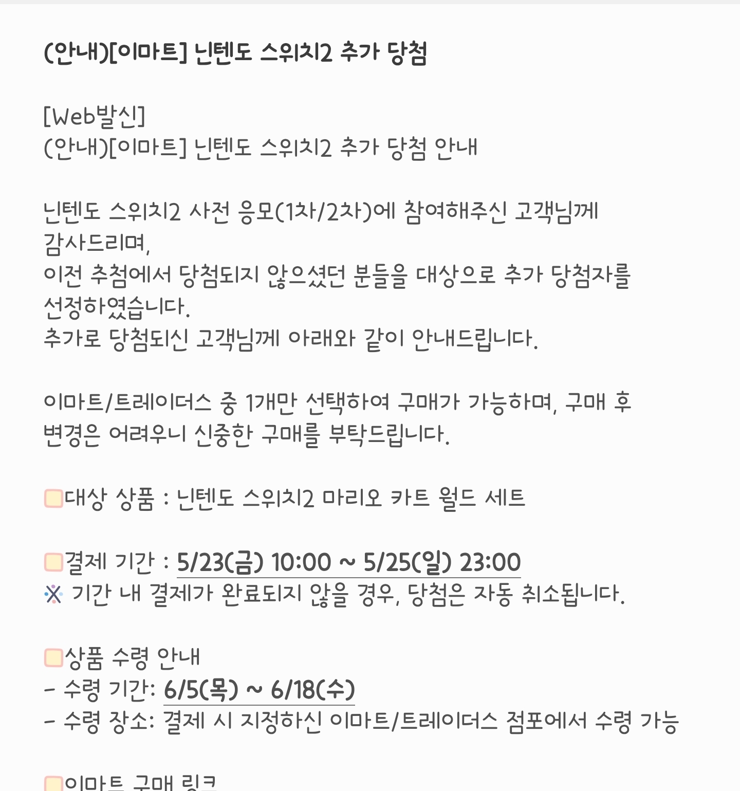 [게임S/W] 이마트.이마트 트레이더스 닌텐도 스위치2 추가당첨 문자안내
