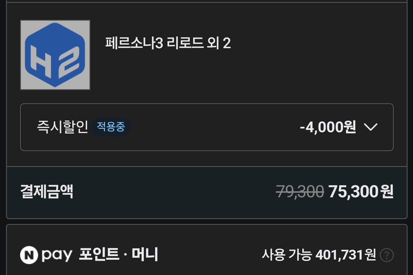 참고로 5만원 이상 네이버페이로 구매하면 4천원 즉시 할인이벤트가 있는것 같습니다! 저는 귀무자2와 페르소나3 리로드+익스펜션까지 같이 구매해서 4천원 추가 할인 받았습니다.