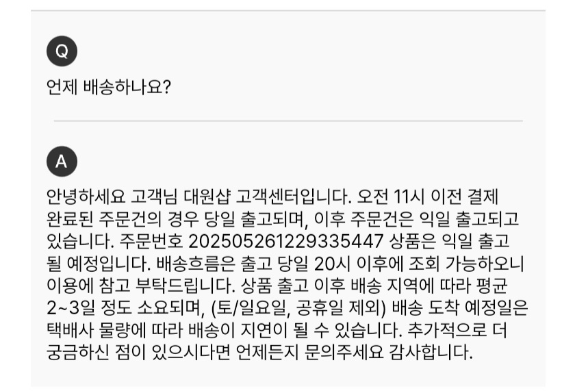 네 내일 출고되나봐요 | 25.05.26 15:37 | | |