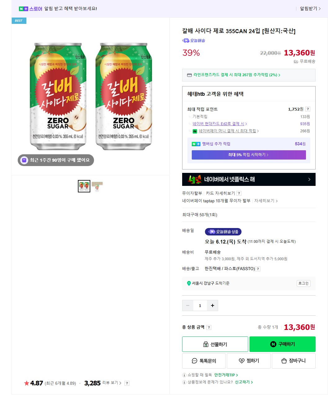 [음식] [네이버] 해태몰 공식 갈배 사이다 제로 355CAN 24입 "13360원" 쿠폰 [35]