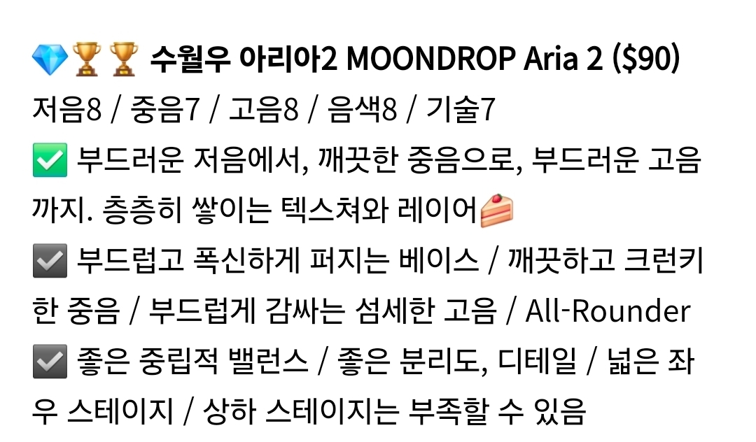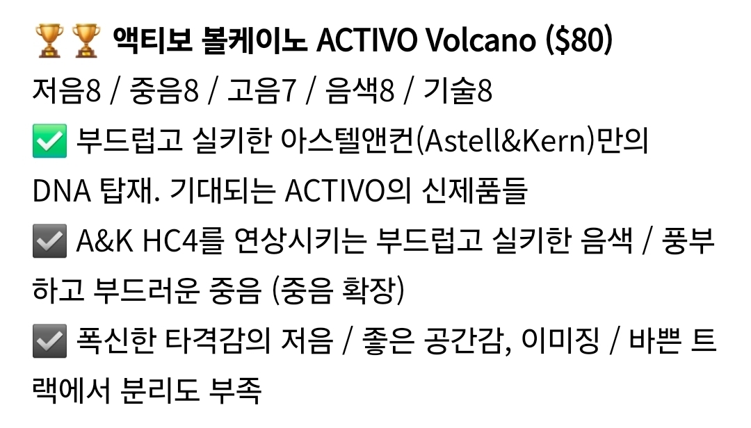 둘이 지향하는 바가 틀려서 비교하기가 힘들긴한데, 대체로 가격대가 비슷한 아리아2랑 비교가 종종 되더라구요. 수월우는 고음강조 여성보컬 최적화, 볼케이노는 소리를 부드럽게 하는 대신 드라이버 3개로 화음강조. | 25.08.13 10:26 | | |