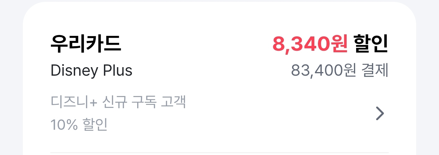 참고로 디즈니플러스 자체에서 1년 구독을 40% 할인한 가격 83400원에 판매중이고 비씨카드 마이태그에 디즈니 플러스 구독 10%캐시백이 있습니다. 태그하고 구독하시면 1년 75,060원입니다. 신규 구독 고객 대상이라고 되어 있는데, 저는 구독 끝난 다음날 결제했는데 혜택 적용 돼서 이틀뒤에 8340원 통장에 입금되더라고요. 저는 체크카드로 해서 바로 입금됐고 신용카드로 하시는 분은 청구할인 될 것 같네요.