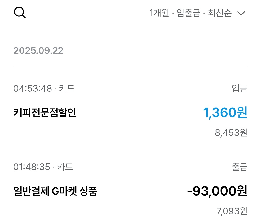 새마을금고 더나은 체크카드 1. 전달 혜택 (간편결제, 온라인쇼핑, 커피전문점)으로 쓴 금액도 실적으로 인정됨. (혜택 받은 금액은 실적 제외되는 카드가 대부분임) 2. "일반결제 G마켓 상품" 이라고 찍힘 (글자수 제한때문에 "권"자가 빠져서 실적 인정되는 중 3. 월 실적인정금액 30만원 글자수 제한때문에 "상품권"이란 글자가 다 안찍혀서 실적 인정되는 중입니다. | 25.09.22 10:42 | | |