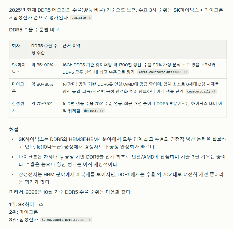 예전에 삼성이 품질이 안 좋아져서 마이크론보다 못한다는 말이 있었는데 아직도 개선이 안 되었나보네요 | 25.10.23 18:18 | | |